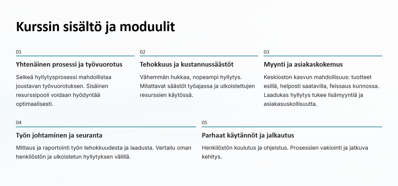 🛒 Miksi hyllykunto ratkaisee?Hyllykunto on kaupan hiljainen menestystekijä – mutta sen vaikutus näkyy kaikkialla: myynnissä, asiakaskokemuksessa ja henkilöstön jaksamisessa.Kun hyllyt ovat tyhjiä, prosessit tehottomia ja vastuut epäselviä, seuraukset näkyvät heti: menetettyä myyntiä, heikompaa palvelua ja kasvavaa kuormitusta.💡 Koulutus, joka tekee hyllytyksestä tehokasta, selkeää ja motivoivaa.Opticraftin kolmen päivän koulutusohjelma yhdistää*Käytännön tekemisen*Myymäläympäristön havainnoinnin*Prosessien ja työnjaon kehittämisen työkalutKoulutus perustuu yli 15 vuoden kokemukseen hyllytyspalveluista, myymälätoiminnan kehittämisestä ja henkilöstöjohtamisesta. Opetamme vain sitä, mikä toimii oikeissa kaupoissa – dataan, prosesseihin ja ihmisiin pohjaten.✅ Tulokset, jotka näkyvät heti arjessa.Koulutuksen avulla:*Parannat tuotteiden saatavuutta & vähennät hävikkiä*Tehostat työnjohdon ja henkilöstön toimintaa*Nostatat asiakastyytyväisyyttä ja myyntiä*Vahvistat henkilöstön motivaatiota ja sitoutumistaLopputuloksena on tehokas, hyvinvoiva ja asiakasta palveleva hyllytysympäristö.🎯 Kenelle koulutus sopii?- Kauppaketjujen alue- ja myymäläpäälliköille- Hyllytyshenkilöstölle ja tiiminvetäjille- Kaupan alan kehittäjille, HR- ja koulutusvastaaville🔍 Miksi valita Opticraft?- 15+ vuoden kokemus ja käytännössä testatut menetelmät- Tulokset, jotka näkyvät myynnissä, työn sujuvuudessa ja työhyvinvoinnissa- Kotimainen, ketterä ja asiakaslähtöinen kumppaniHelsingissä